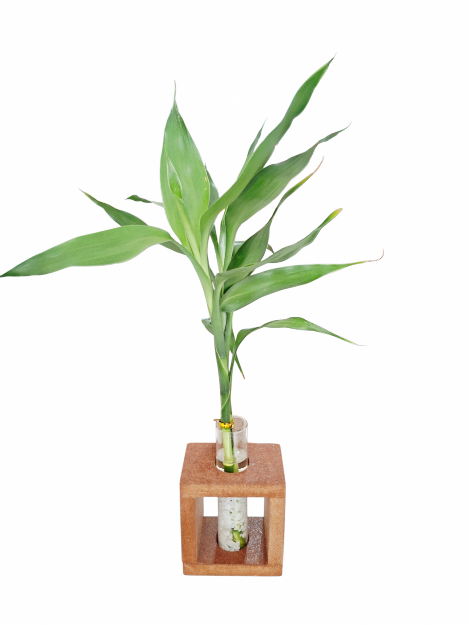 Bambu da sorte em suporte de madeira e vidro com pedras, de fácil manutenção, ideal para decorar ambientes internos. Essa planta atrai prosperidade, fortuna e boas energias na casa, mas devem ser ganhadas de presente!