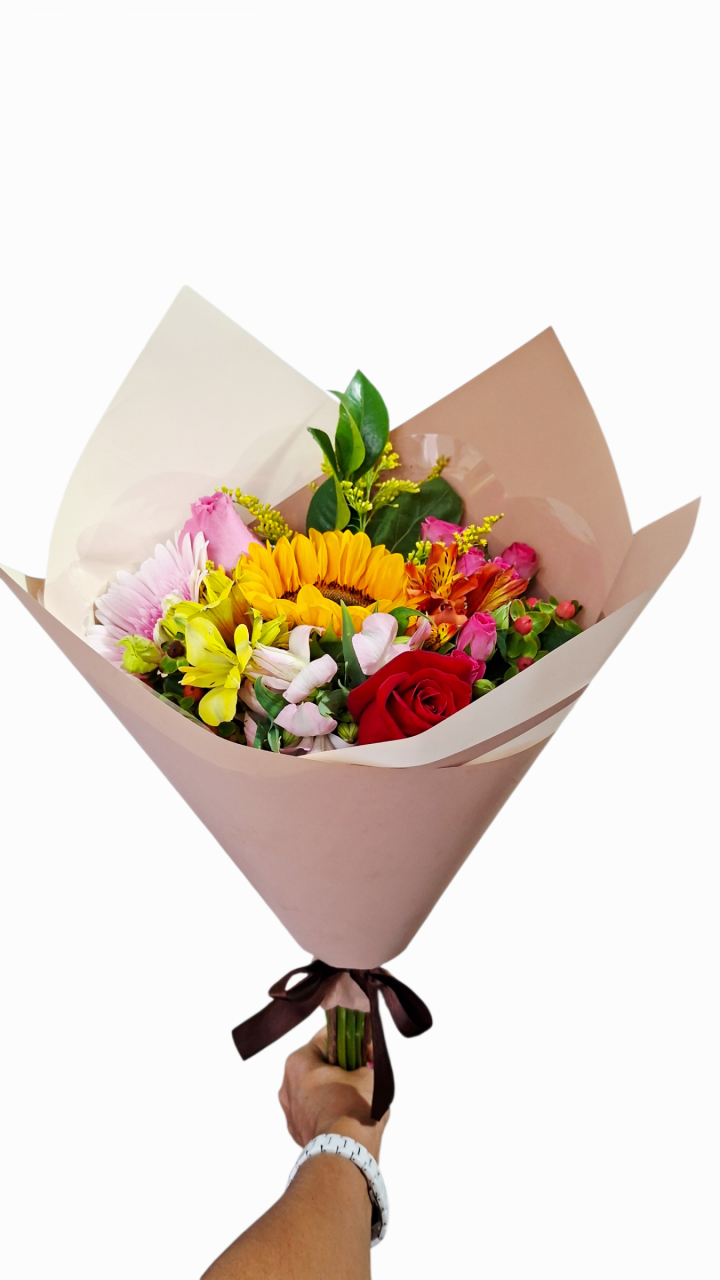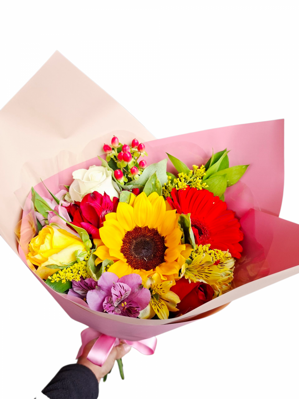 Flores: rosas, alstroemerias, girassol, gerbera, tango, folhagem.