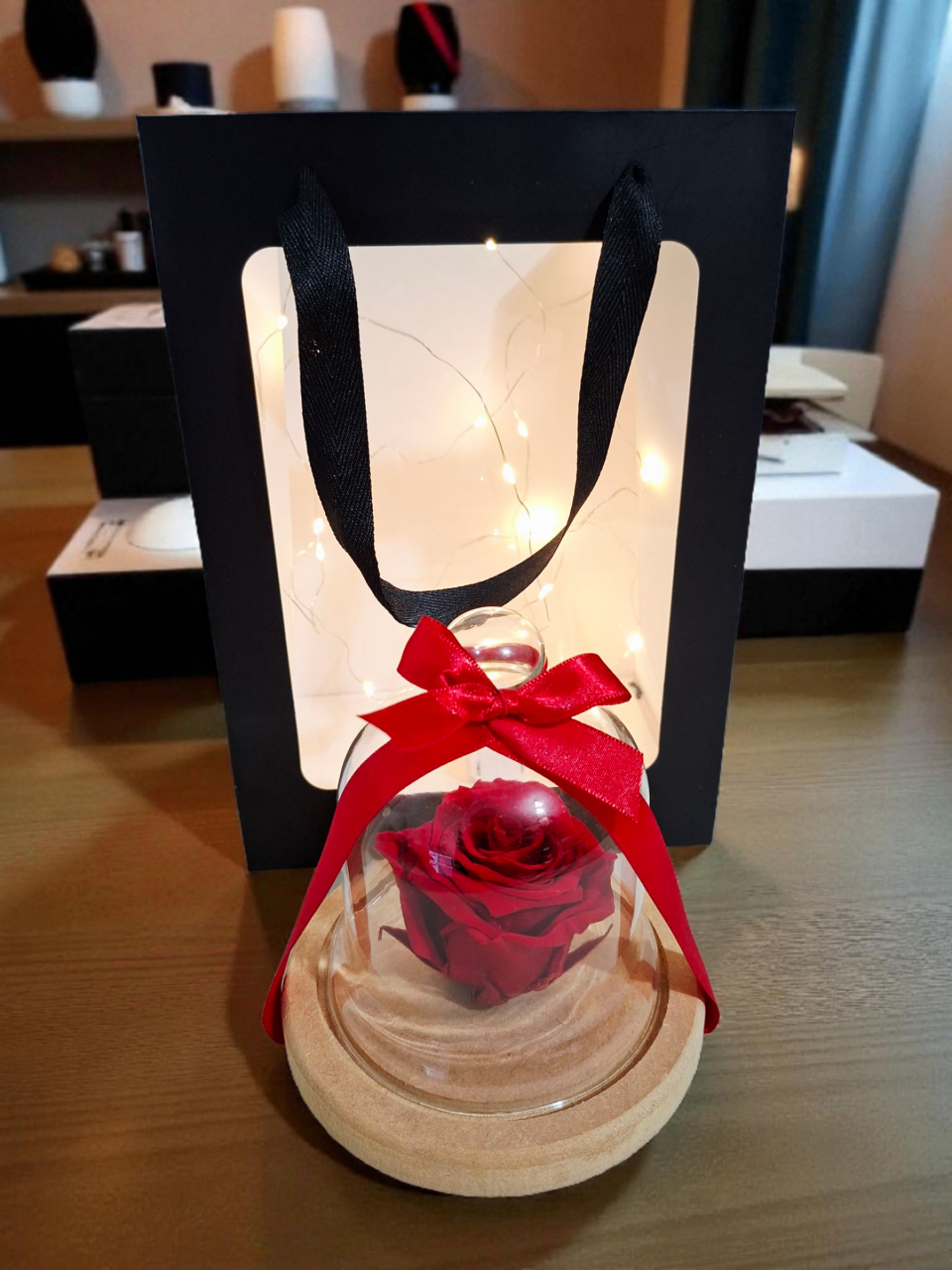 “A Rosa Encantada é poesia preservada no tempo. Uma rosa natural, cuidadosamente tratada para durar anos, protegida sob uma cúpula de vidro que dá aquele ar de magia e eternidade. É o símbolo perfeito de um amor que não desbota, de memórias que ficam, de gestos que atravessam o tempo. Um presente que fala por si: intenso, elegante e inesquecível.”