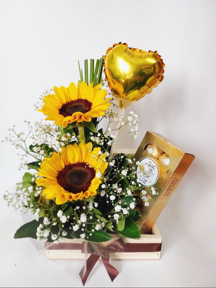 Carregando...Este deslumbrante 'Baú Girassol com Ferrero Rocher' é uma verdadeira obra de arte. Dentro de um baú meticulosamente trabalhado em madeira, você encontrará um belo arranjo contendo dois vibrantes girassóis, acompanhados por uma caixa de bombons Ferrero Rocher de 100g, proporcionando uma experiência gourmet irresistível. O toque final fica por conta de um mini balão metalizado, adicionando um charme extra a este presente. Além disso, oferecemos opções variadas de chocolates, tais como uma caixa de Raffaello ou uma caixa de bombom Alpino. Basta informar a sua preferência via chat. Em caso de indisponibilidade de algum item, garantimos a substituição por outro de igual valor, mantendo a qualidade e beleza do conjunto.